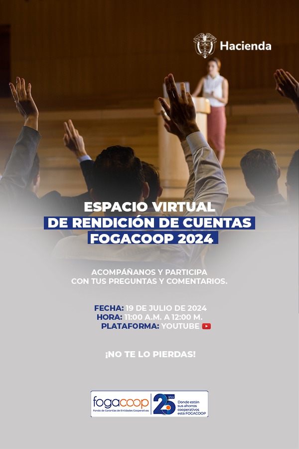 FOGACOOP realizará un espacio virtual de rendición de cuentas el viernes 19 de julio a partir de las 11 am y hasta las 12 m., a través del portal WEB por Youtube, donde se brindará información de los avances más importantes del primer semestre del 2024, y se tendrá la oportunidad de oír tanto a funcionarios del Fondo como a representantes de las cooperativas inscritas, para lo cual los(as) invitamos a que nos acompañen y formulen sus preguntas e inquietudes durante dicho espacio.